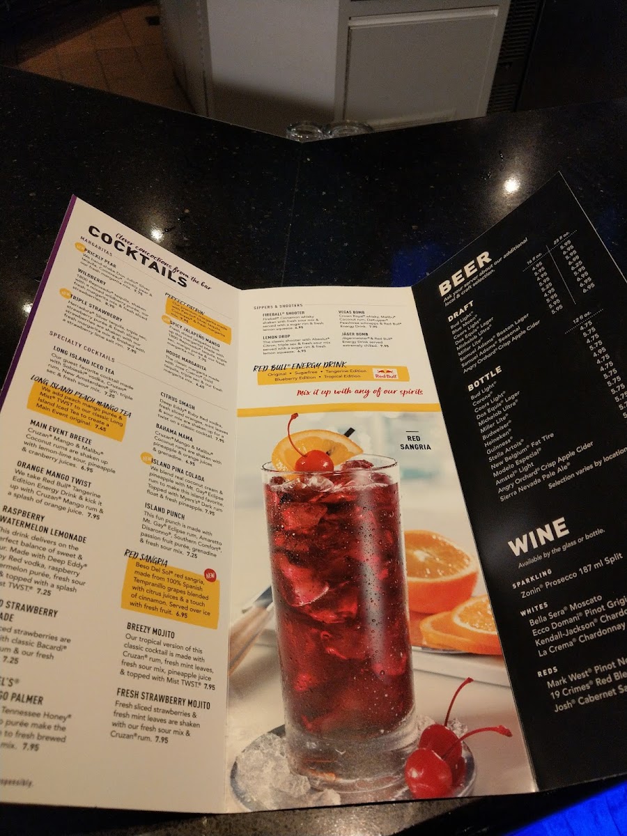 Desserts and Drinks: The menu features sweet options such as chocolate chip cookie sundaes, birthday cake, and cotton candy cocktails. Beverage selections include beer and orange-based cocktails, catering to different preferences.
